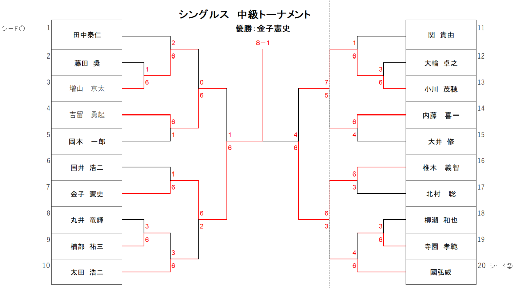 中級リーグ ・6ゲームマッチ:セミアドバンテージ、6ゲームオール後7ポイントタイブレーク ※参加者多数のため、8ゲームから6ゲームに変更しました。