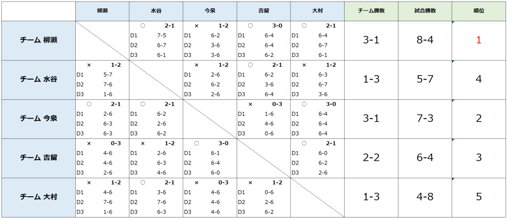 ・ダブルス3本 、1セット先取ノーアドバンテージ 6-6 7ポイントタイブレーク方式 ※基本、重複出場無し 試合進行によって2-2スタートとなる場合がございます。